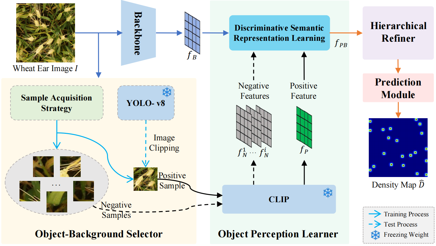 overview: As shown in Figure 1, WheatGOAT includes a backbone network, an Object-Background Selector (OBS), an Object Perception Learner (OPL), a Hierarchical Refiner (HR), and a Prediction Module (PM). The backbone extracts features from wheat images, OBS separates wheat ears from the background, OPL uses vision-language learning to better distinguish ears, HR refines details using multi-scale context, and PM generates a precise density map for counting. This combined approach improves accuracy and adapts well to different field conditions and crop types.