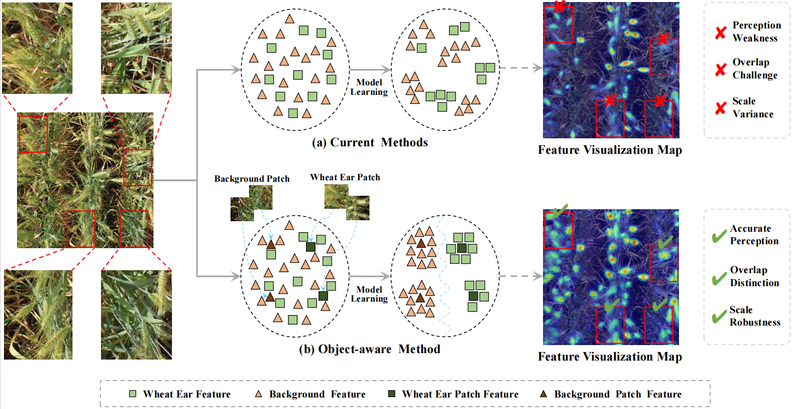 Figure 1: (a) Current methods count wheat ears from the full image but often fail with overlaps and background noise. (b) The object-aware method uses wheat ear and background patches to guide learning, improving accuracy in complex and cluttered scenes.