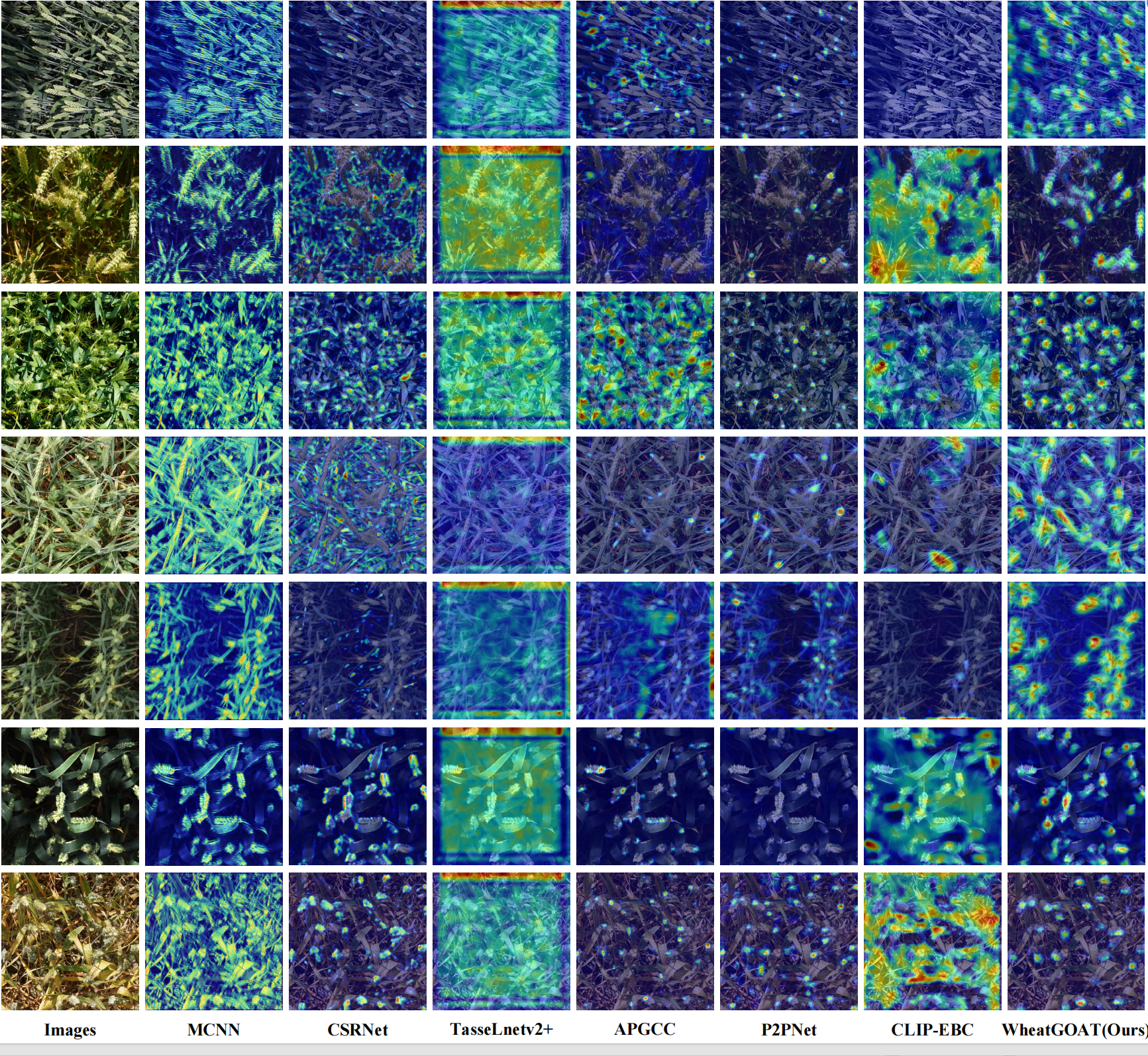 Figure 2: Visualization of model attention using Grad-CAM across various wheat ear counting methods.